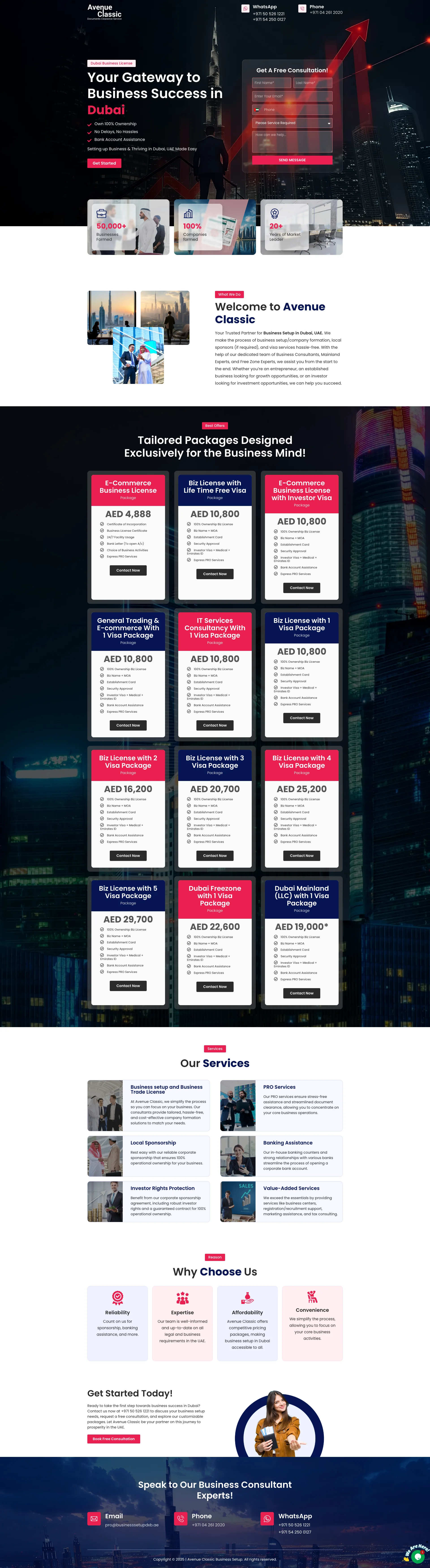 We designed a high-converting landing page for Avenue Classic, a Dubai-based business setup and documents clearance company. The project focused on a clean, modern interface, optimized user journey, and lead generation. Built using WordPress and Elementor, the page is fully responsive, SEO-friendly, and performance-optimized for fast loading. The layout highlights Avenue Classic’s expertise in Dubai business license, company formation, and bank account assistance, helping visitors easily connect and get free consultations. This landing page enhances brand credibility, boosts engagement, and drives qualified business leads in the UAE market.